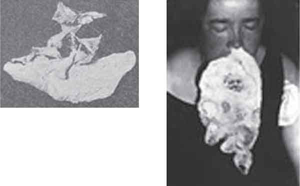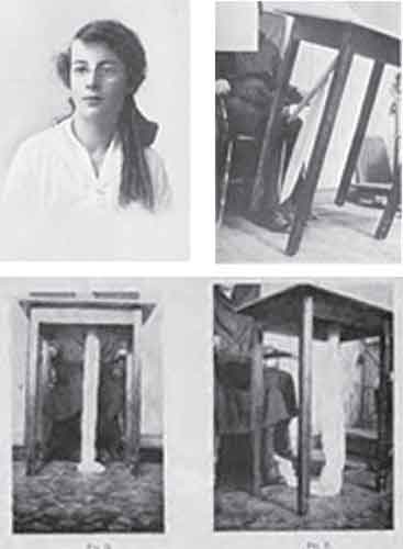 .....Other reports mentioned “a slender attachment as of gossamer” and a “gossamer fi lament” (Colley 1877:557), “something white” on the floor (Lamb et al. 1875:10), a “dingy, white-looking substance” (Farmer 1886:178), and a “a small white patch, about the size of a lady’s handkerchief” (Rhodes 1876:23). Interestingly in these reports, and in others (e.g., Oxley 1876), the forms observed were connected to or developed into human bodies. .....There were also many discussions of materializations during the first decades of the Twentieth Century, as seen in the writings of Gambier Bolton (1914/1919), Paul Gibier (1901), Enrico Imoda (1912), Enrico Morselli (1908), and Charles Richet (1905). Of particular importance was the work of French sculptress Juliette Alexandre-Bisson (1921), German physician Baron Albert von Schrenck-Notzing (1920a), French physician Gustave Geley (1918, 1919/1920, 1924/1927), and New Zealand–born mechanical engineer William J. Crawford (1921) (Figure 2). Their descriptions of ectoplasm provided much information about this mysterious substance. A rarely cited example is the following, which took place with medium Eva C. (Figure 3), who may have been the first medium to produce amorphous masses of ectoplasm that sometimes took various shapes: