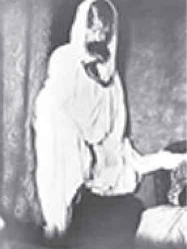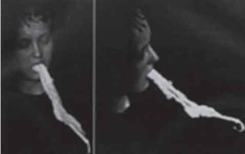 Schrenck-Notzing provided many descriptions of ectoplasm. With Polish medium Stanislawa P., he observed a long mass coming from her mouth suspended in the air (Figure 4). “It comprised along its whole length two strips, which coalesce or are woven together ... The surface appears rough, formed, and somewhat resembling a wool product” (Schrenck-Notzing 1920a:254). In another example with medium Willy Schneider, a photo of ectoplasm taken in 1919 was described as a “large mass of white substance covers the right shoulder and upper arm, like a white napkin, and is fastened at the neck” (Figure 5) (Schrenck-Notzing 1920a:336).